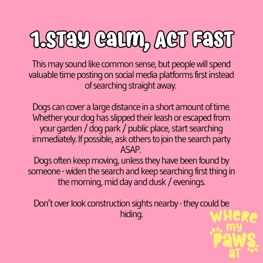 - Search local area on foot—dogs often circle. Use scent items (blanket, your clothes).