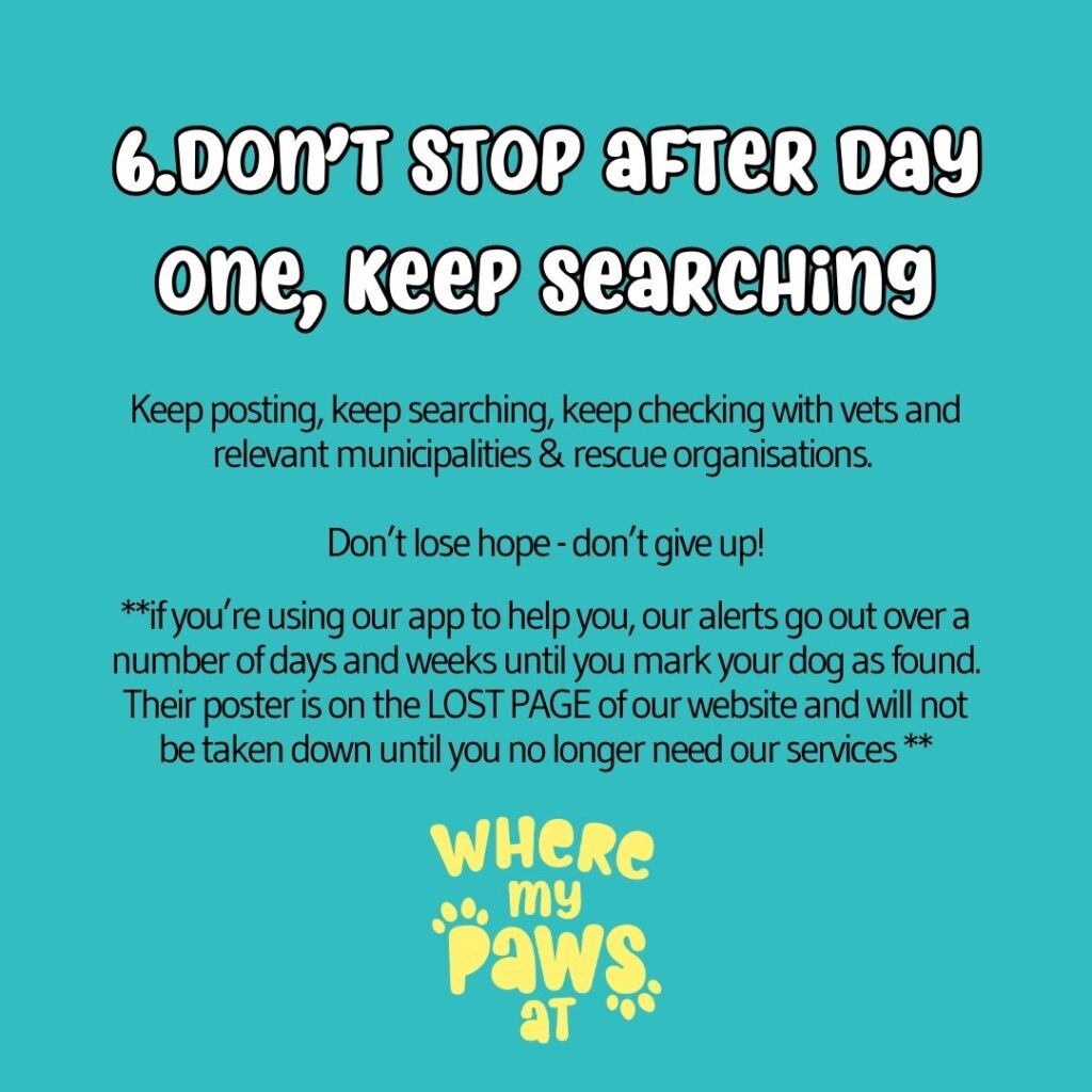 - Post on your local community pages – Facebook / Whatsapp – make sure you include your contact details and as much information about your dog as possible – like unique markings, approach slowly, they are scared of strangers etc.