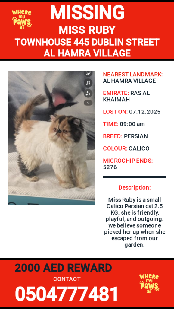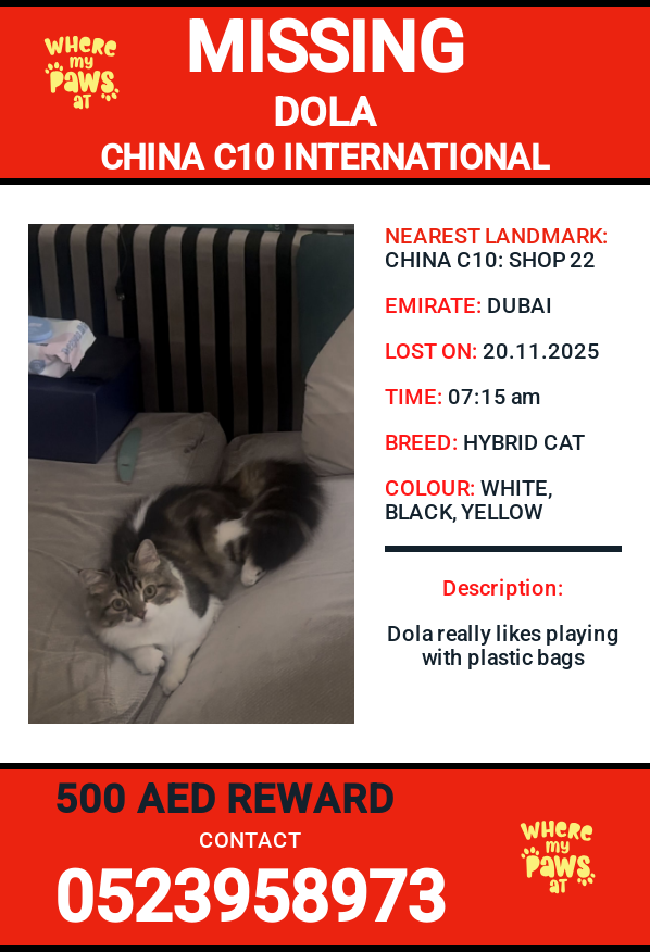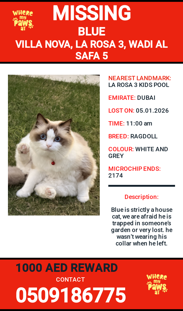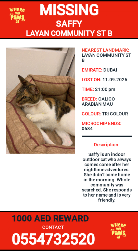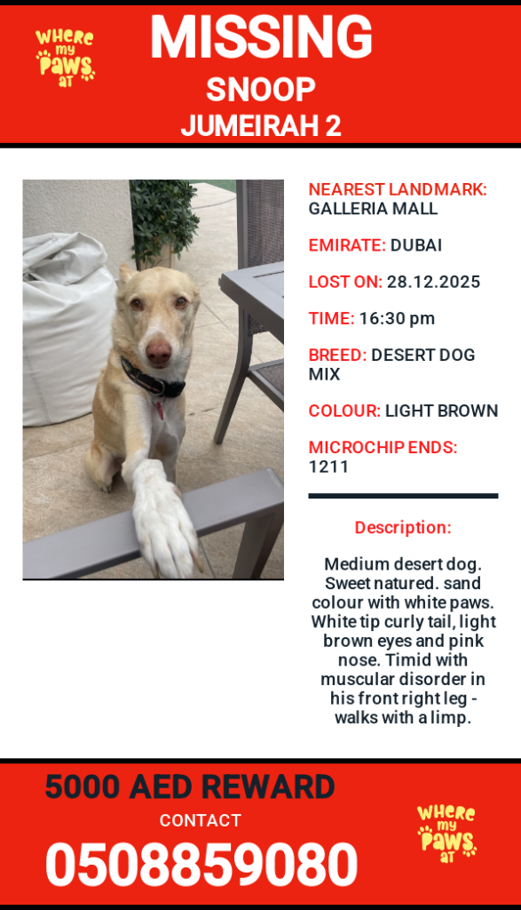 Where My Paws At is dedicated to helping lost pets in the UAE. Please take a moment to check the lost pet posters below for all lost dogs and cats on our app in the UAE.