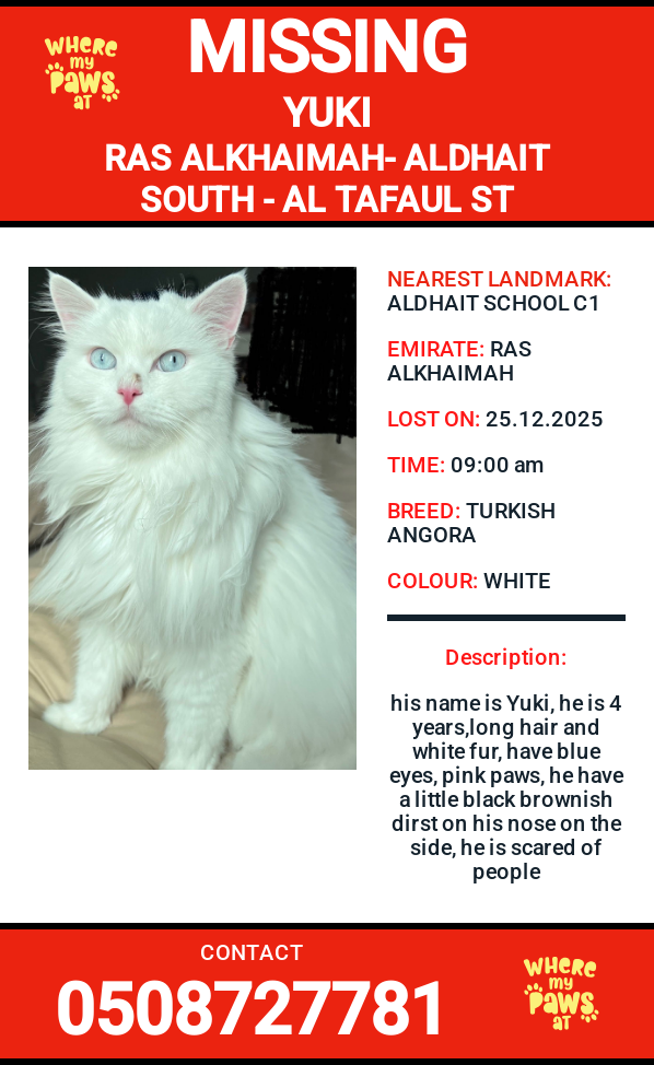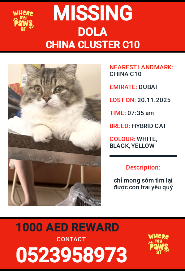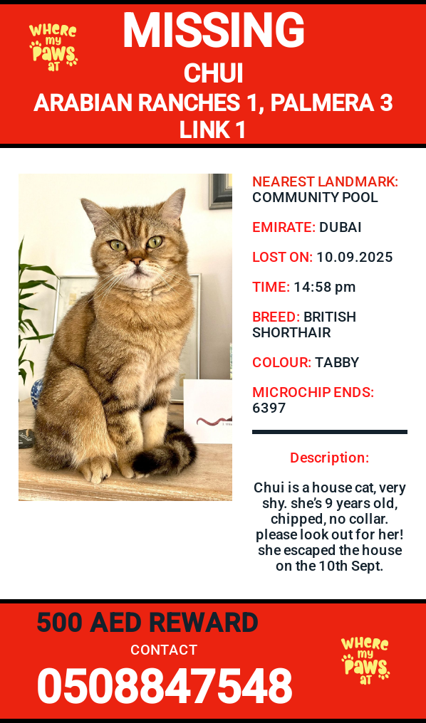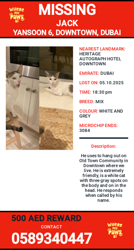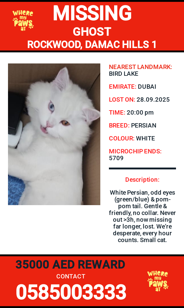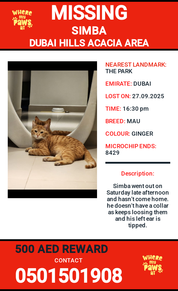 Where My Paws At is dedicated to helping lost pets in the UAE. Please take a moment to check the lost pet posters below for all lost dogs and cats on our app in the UAE.
